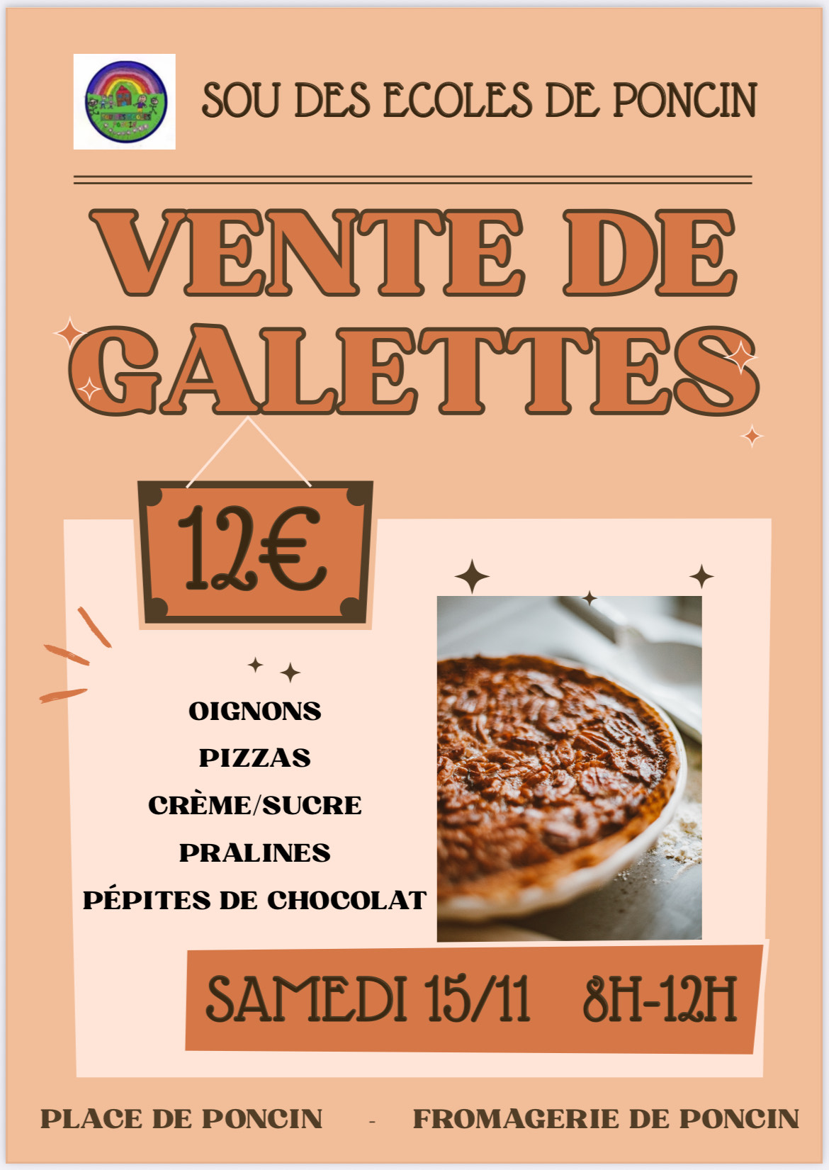 Vente de Galettes – 15/11/2025 Vente de Galettes du sou des écoles le samedi 15 novembre à partir de 8h sur la place de Poncin ainsi qu’à la fromagerie. Venez nombreux 🤩 ⚠️ stock limité